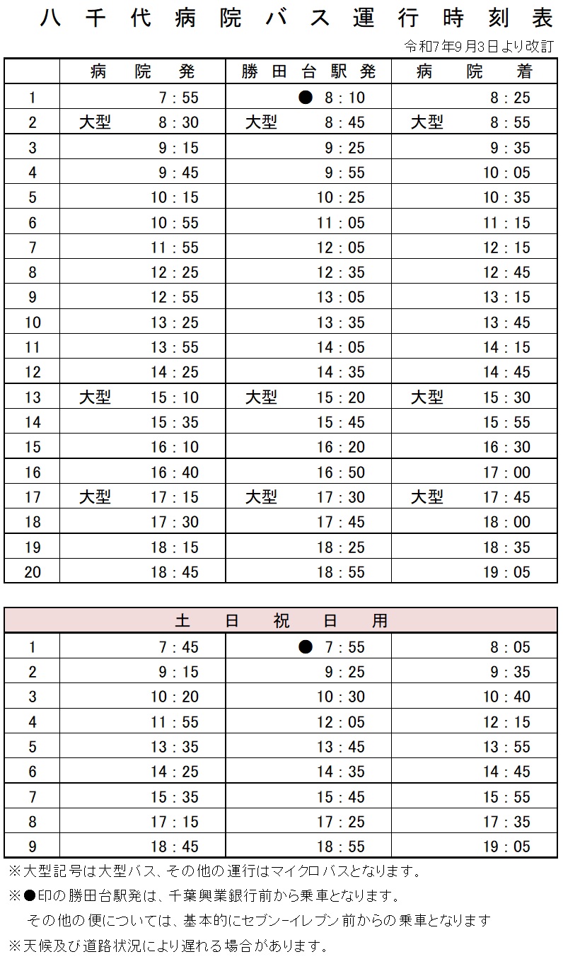 千葉方面からこられる場合、国道16号線を北上し、村上団地付近をすぎた宮内歩道橋交差点を右折してください。1kmほどまっすぐ進みローソンのある手前の交差点を左折しますと、すぐに右にそれる道路がございますのでそちらを右折してください。2分程まっすぐ進んでいただくと、右手に八千代病院がございます。